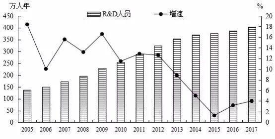 按全时当量统计,2017年我国R&D人员总量为403.4万人年,比2016年增加15.6万人年,增速为4.0%,比上年提升了0.8个百分点。